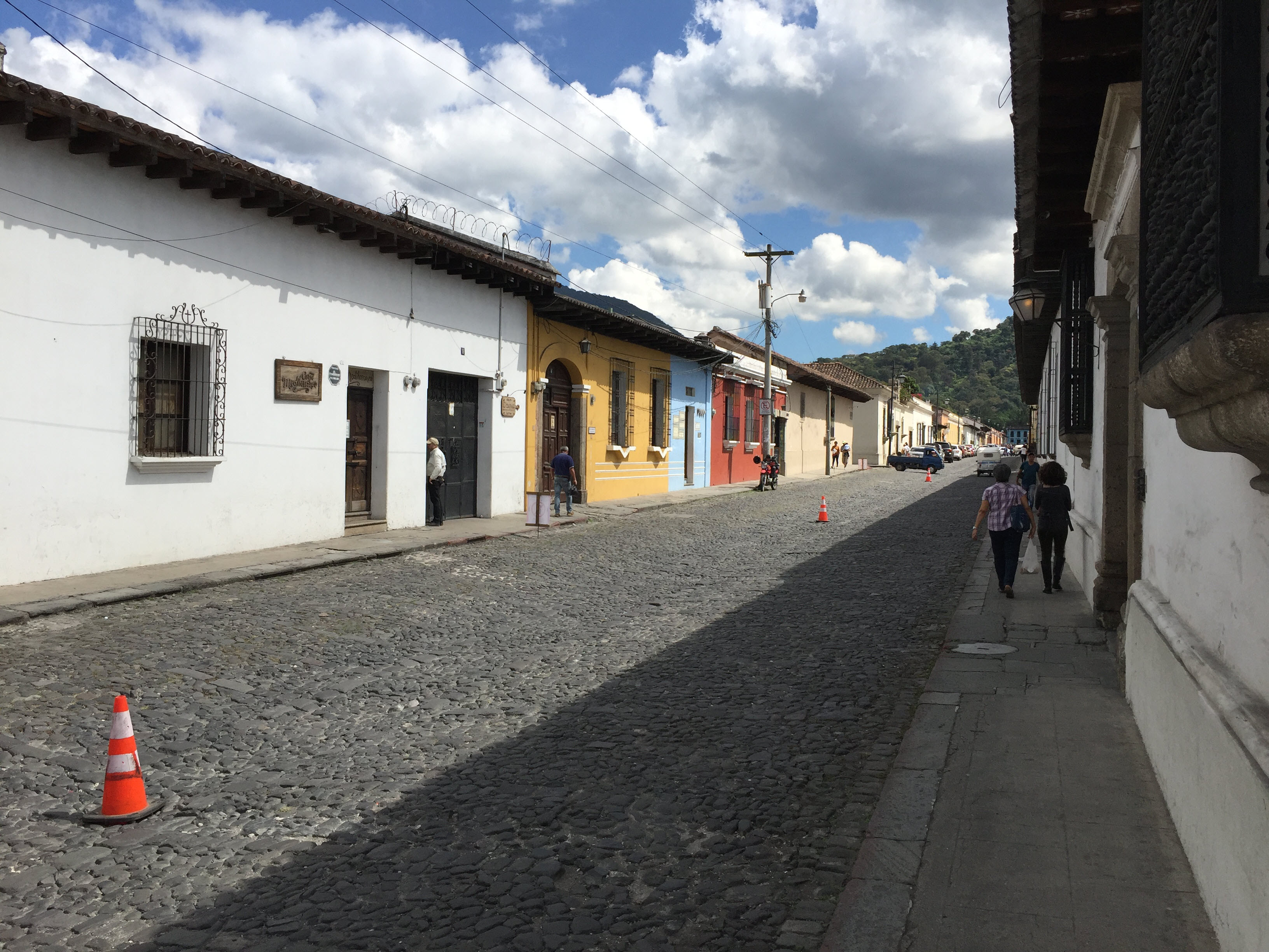 We are visiting Antigua, one of the most historic cities in Guatemala. I can definitely say I am experiencing culture shock. Antigua is very different from any city I have ever visited, and some main features are very characteristic. For instance, all the roads in the city are paved with cobblestones, very rough cobblestones. They are lined by narrow sidewalks, often broken, with major holes and walking hazards.