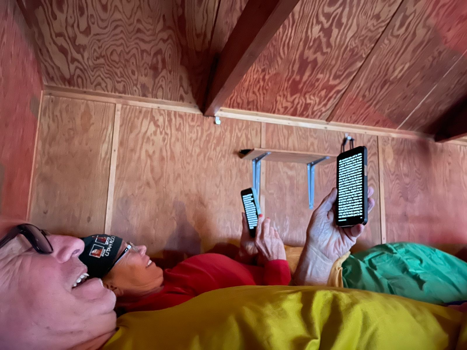 At þverbrekknamúli, as we were all getting ready to sleep, my wife and I had doubled up in one bunk. There were not enough bunks in the hut for everyone to have their own. Here we are, reading before going to sleep. Note how little head-room there is.