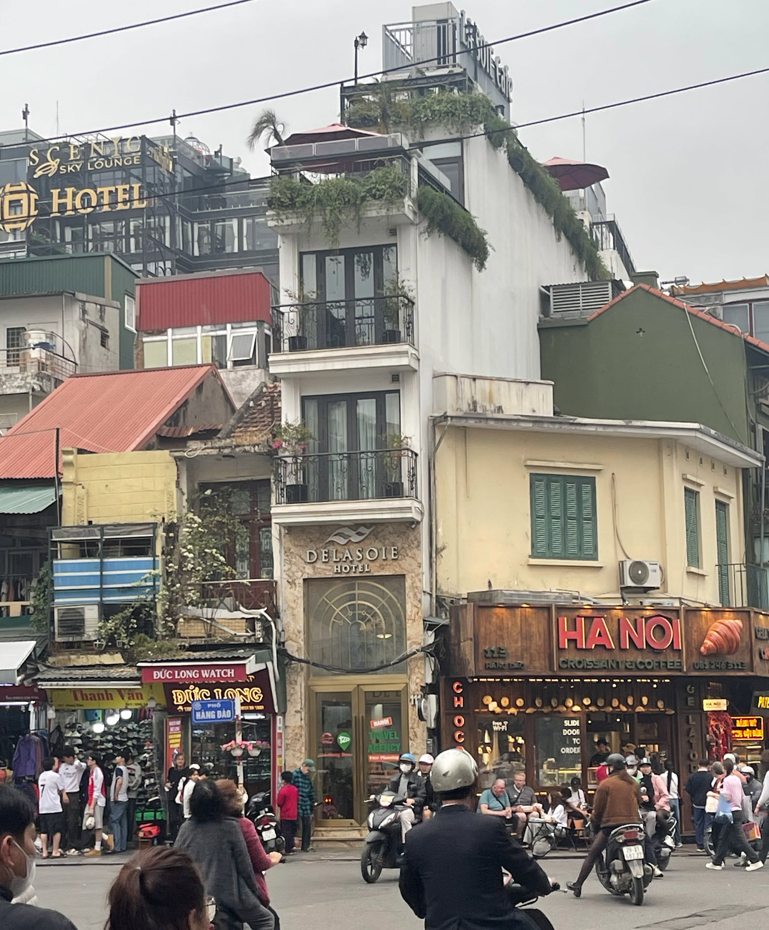 Another street view in Hanoi. A narrow hotel, the De La Sole Hotel. It can’t have too many rooms in that narrow tower.