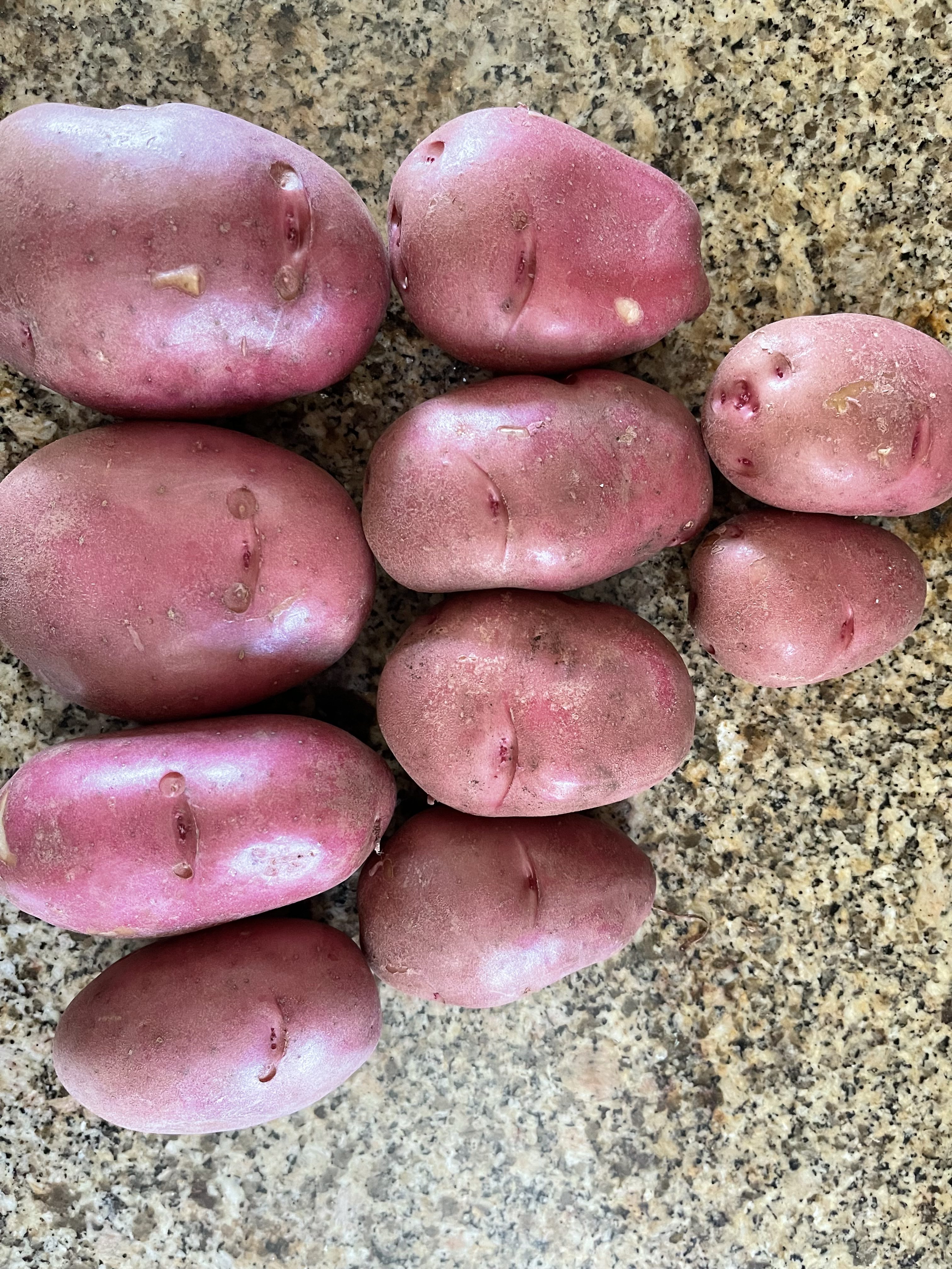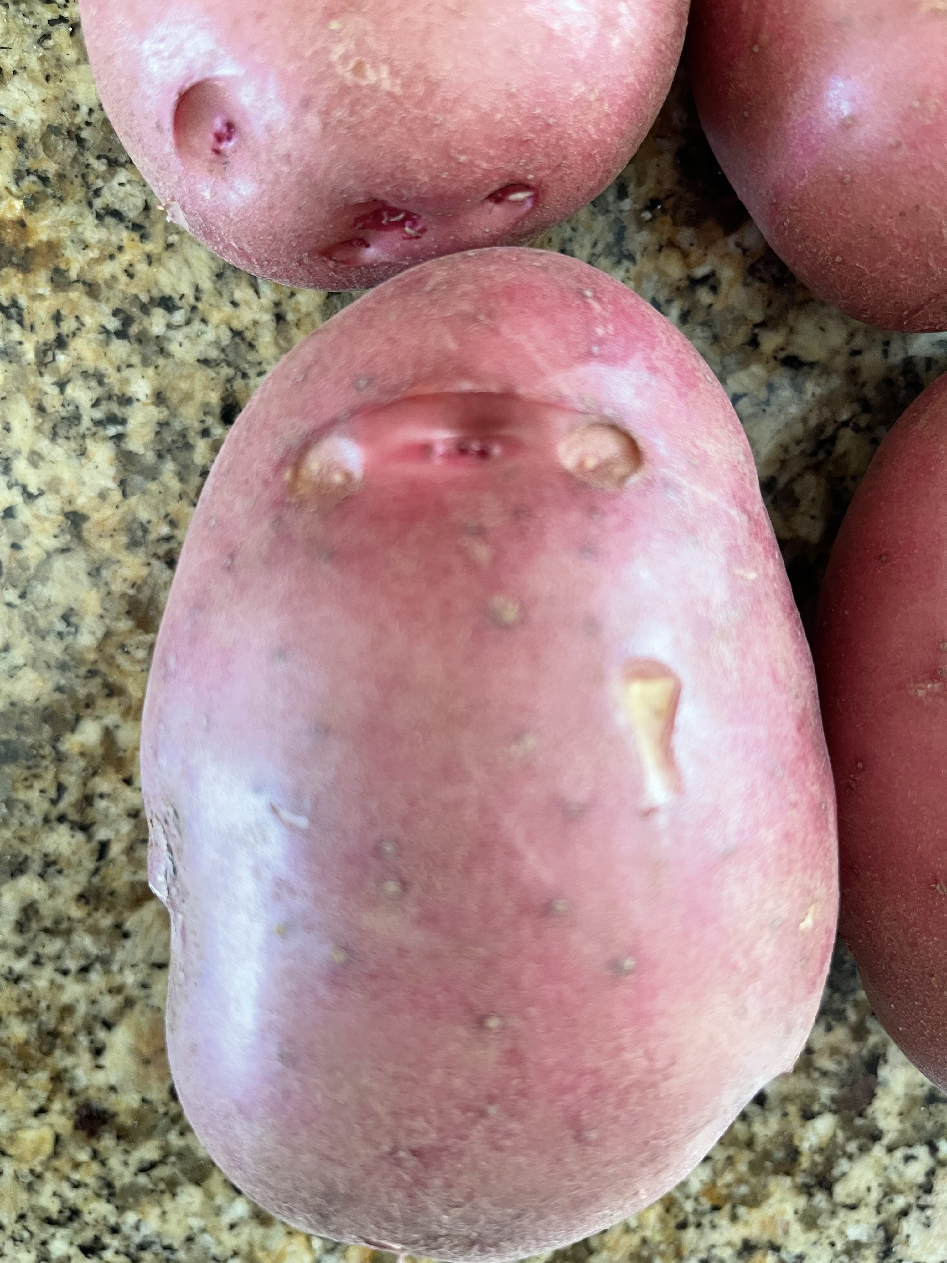 Then I noticed that each potato had a mark on it. I can’t figure out how this happened. They were not smashed against the planter, and its walls are smooth. There are no features that would cause these repeatable marks. If you don’t see it, look at this one closeup: